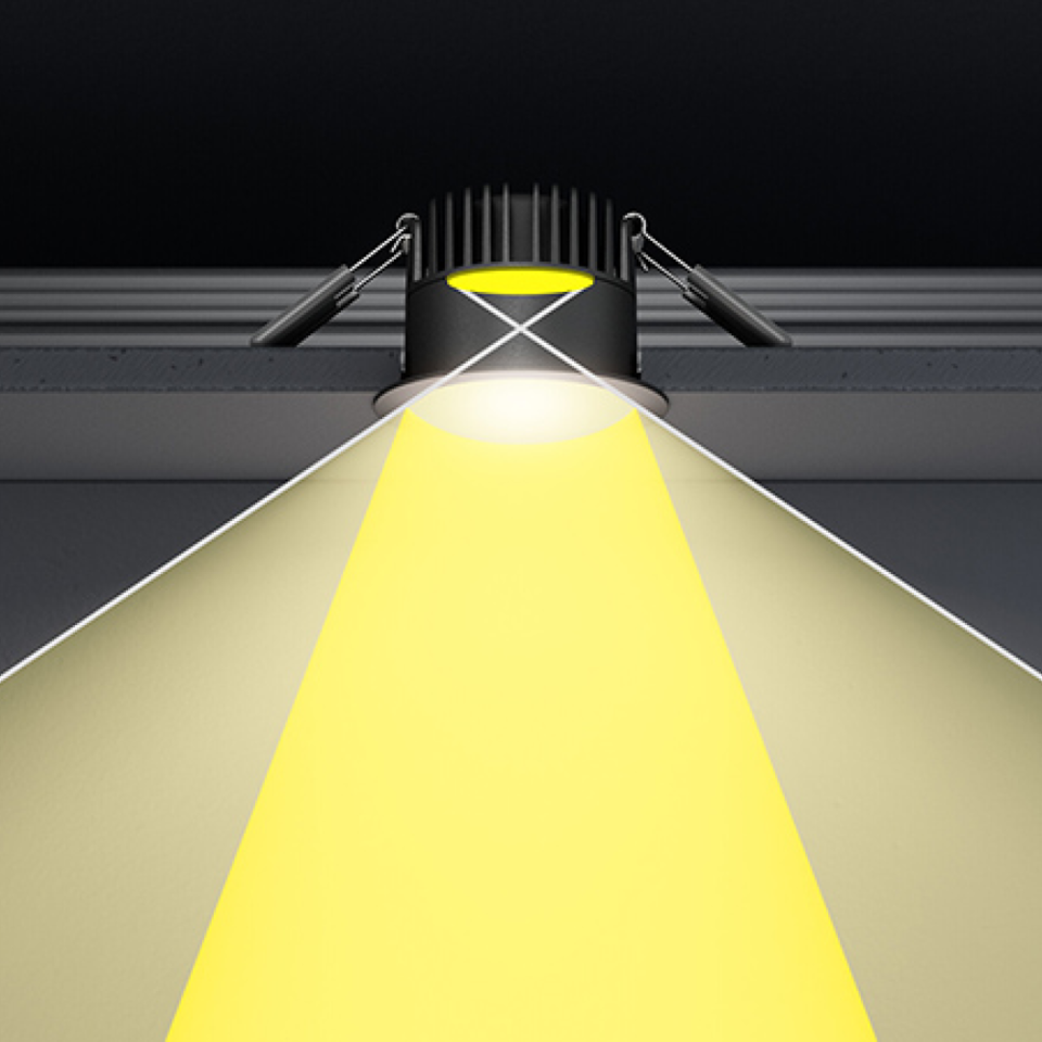 Die Lichtleistung der SPOT DARKLIGHT, das tief im Gehäuse versenkt ist, bietet einen weiten oberen Abschirmwinkel und damit eine hervorragende Entblendung - besonders in der schwarzen Gehäuseversion mit einer warmweißen Lichtfarbe. Zusammen mit der einfachen Dimmbarkeit der Leuchte, schafft dies einen hohen Lichtkomfort.